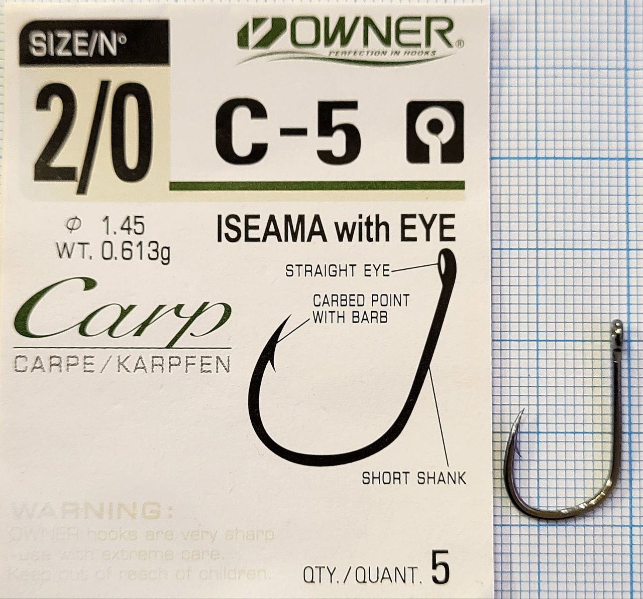 Owner Seama with Eye C-5 — високоякісні ковані коропові гачки з коротким цівком та гострим ігольчастим жалом. Оснащені міцним колечком для зручного прив’язування волосіні або повідка. Завдяки особливій технології кування гачки мають високу міцність на розрив і відмінну стійкість до розгинання при навантаженнях.
