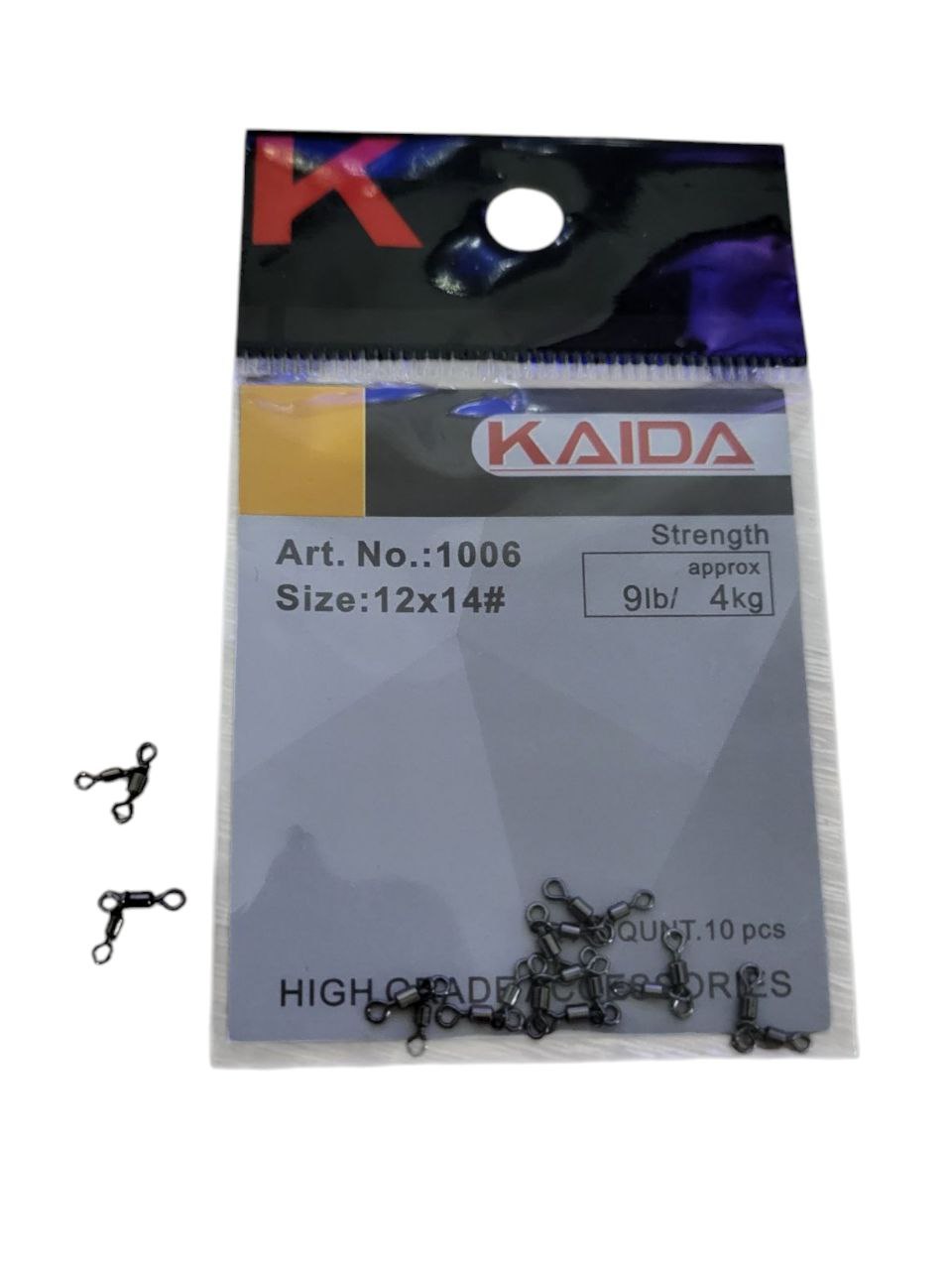 На фото вертлюг для риболовлі KAIDA Art. No: 1006, який використовується для запобігання скручування волосіні під час риболовлі.
